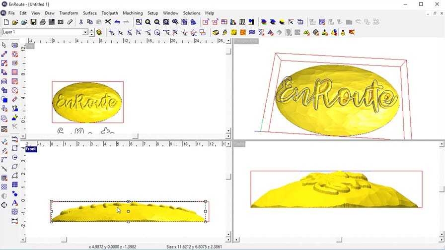 With EnRoute you can simulate a rendered view of the design output so you can catch mistakes before you output the final piece. All tool shapes are accurately rendered allowing both 2D and 3D toolpaths to be rendered.